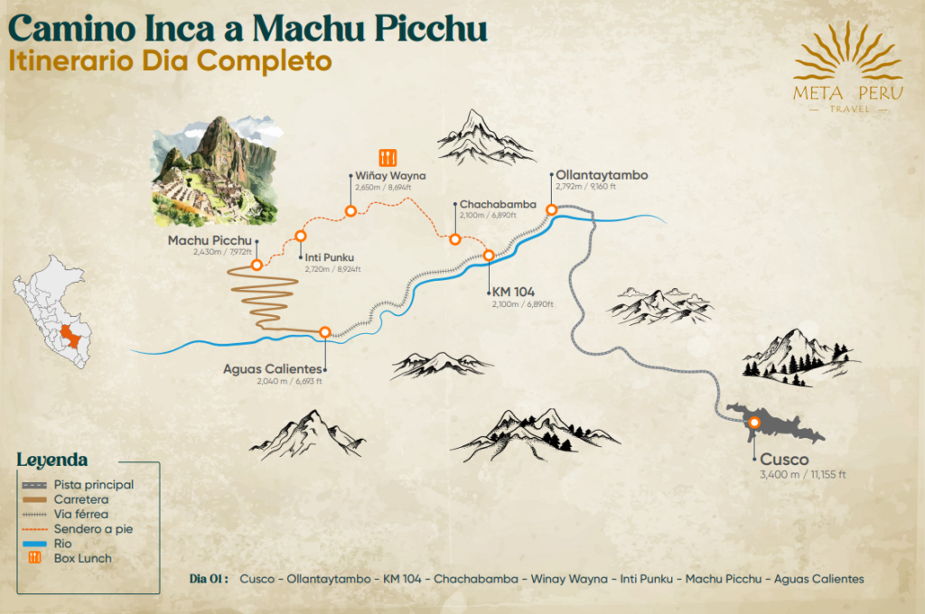 Approximate walk: 5 – 6 hrsRECOMENDACIÓN: Always carry your ID or passport, as it is required to enter the archaeological sites and to board the train. Wear comfortable clothing, a waterproof jacket, and hiking boots. Don't forget water, sunscreen, sunglasses, and your passport. Walk at your own pace, as the route includes some uphill sections, and always pay attention to your guide's instructions to enjoy the tour safely.