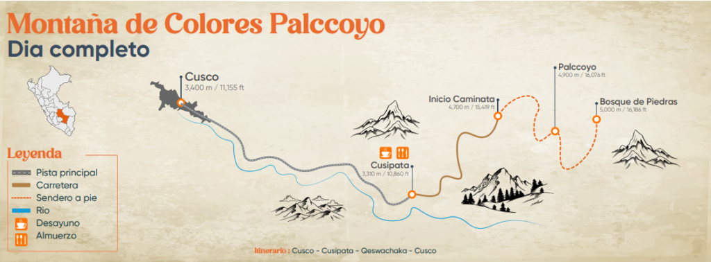 Then we continue towards Combapata for approximately 2 hours to the start of the Palccoyo hike, located at about 4,900 meters above sea level. Unlike Vinicunca, this hike only requires a 40-minute to 1-hour walk along flat, well-marked trails.