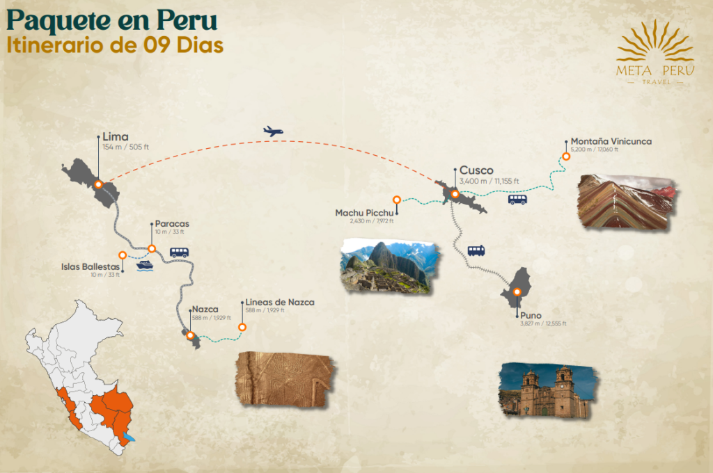 Discover Peru through a diverse 9-day journey that connects the Pacific coast, ancient desert mysteries, and the heart of the Andes. This itinerary combines Lima city highlights, Paracas and Huacachina desert landscapes, the Nazca Lines flight experience, and the cultural treasures of Cusco and the Sacred Valley, ending with a guided visit to Machu Picchu.