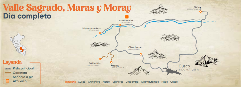 This itinerary covers key archaeological and landscape highlights such as Pisac, Moray circular terraces, the Maras Salt Mines, Ollantaytambo fortress, and panoramic valley viewpoints — all led by a professional bilingual guide and supported by comfortable tourist transportation.
