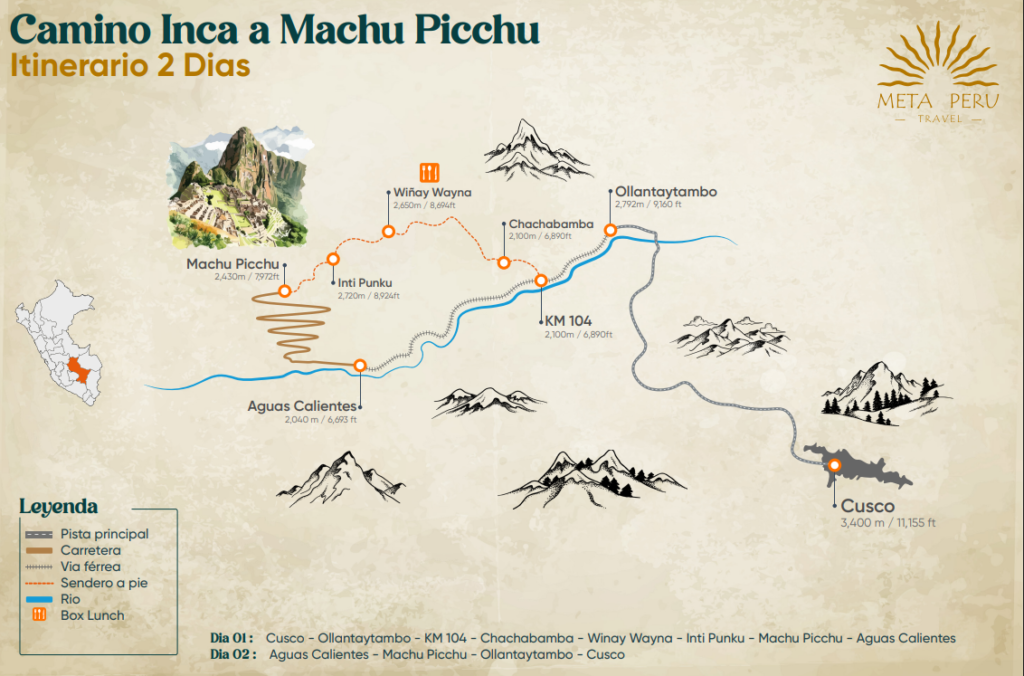 This program includes train transportation to Km 104, guided trekking along original Inca paths, visits to archaeological sites such as Chachabamba and Wiñay Wayna, Sun Gate entry with panoramic views of Machu Picchu, overnight stay in Aguas Calientes, and a guided tour of the Machu Picchu citadel on the second day.